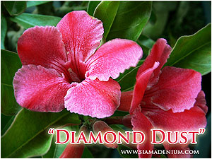 Crossing with different parents”. This method will help you to produce new variety not only still have some mother’s characters but also create some newer characters show up in next crossing’s generation. Our first Adenium with dusty flower was called “Diamond Dust” released on year of 2008. She came from “Adenium Crispum” developing. Her flower mostly has a couple clear red stripes from throat to end of petal. There is also some small area of tiny spots or dust besides the stripe area. This was our start to produce this dusty character. We need to make this spot area to spread more and clearer to become with better dusty style.
